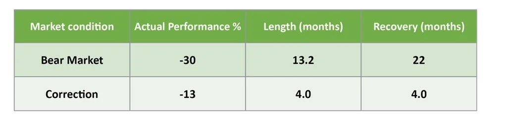 Staying the course of an asset allocation can be difficult in the face of a falling market. It’s important to understand how long such market contractions may last, and how long it may take for your portfolio to recover—before it can then begin to increase again. The table below lists historical average market performance during bear markets and market corrections since World War II, as well as the length of time they lasted on average and the time for a portfolio to recover to pre-drop levels.